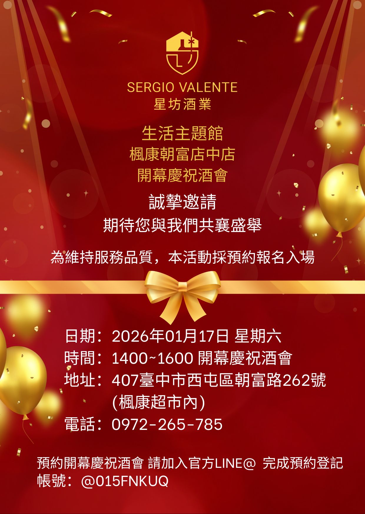 酒會採預約制,請先加入Line官方帳號@015fnkuq進行預約